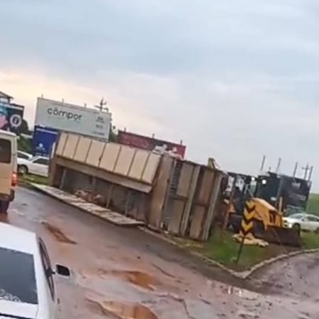 Carreta sai da pista em curva na RSC-472, em Linha Turvo, entre Três Passos e Tenente Portela