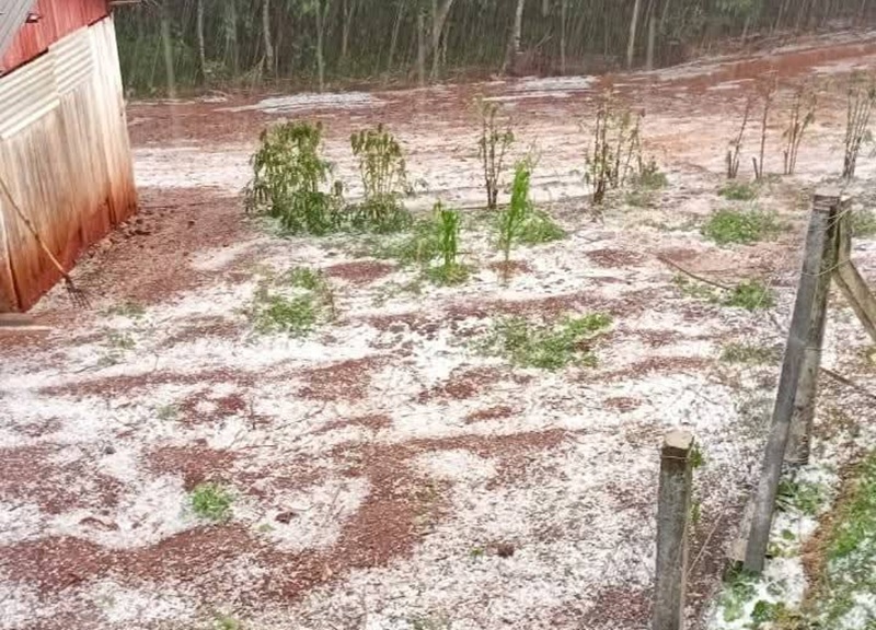 Moradores enviaram registros mostrando o grande volume de granizo que caiu em poucos minutos. Em algumas áreas, o acúmulo de pedras impressionou pela quantidade.