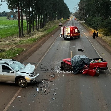 Uma colisão frontal entre uma Renault Oroch e uma Volkswagen Saveiro resultou em uma vítima fatal na manhã deste sá...