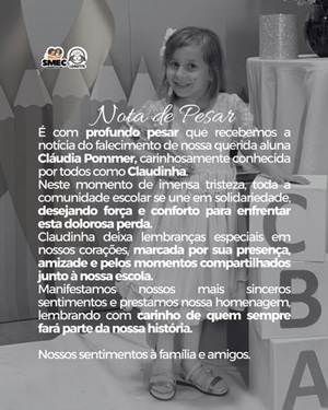 A comunidade escolar de Chiapetta está de luto pela morte da pequena Cláudia Pommer, a Claudinha, aluna da rede municipal que foi vítima de um incêndio registrado no município. A notícia gerou grande comoção entre professores, colegas e moradores, que prestam homenagens e solidariedade à família neste momento de profunda dor.
