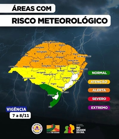 Entre a madrugada de sexta-feira (07) e no decorrer de sábado (08), o aprofundamento de um sistema de baixa pressão e posterior formação de um ciclone extratropical no oceano provoca tempestades severas no Oeste, Missões, Noroeste, Centro e Norte do Estado. Estão previstas chuvas intensas, com acumulados expressivos, rajadas de vento que podem ultrapassar os 100 km/h, queda de granizo de grande porte e descargas elétricas. Há possibilidade de formação de uma Linha de Instabilidade com potencial de rajadas de vento severas e tornados, especialmente nas regiões Noroeste e Norte na tarde de sexta-feira (07).