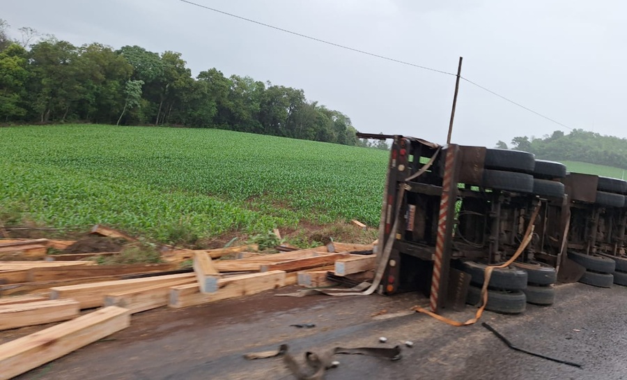 Conforme informações, um caminhão, um Volvo FH carregado com peças de madeira tombou na localidade de Km 12, deixando o trânsito em meia pistas. Equipes de socorro se deslocaram ao local para atendimento da ocorrência.