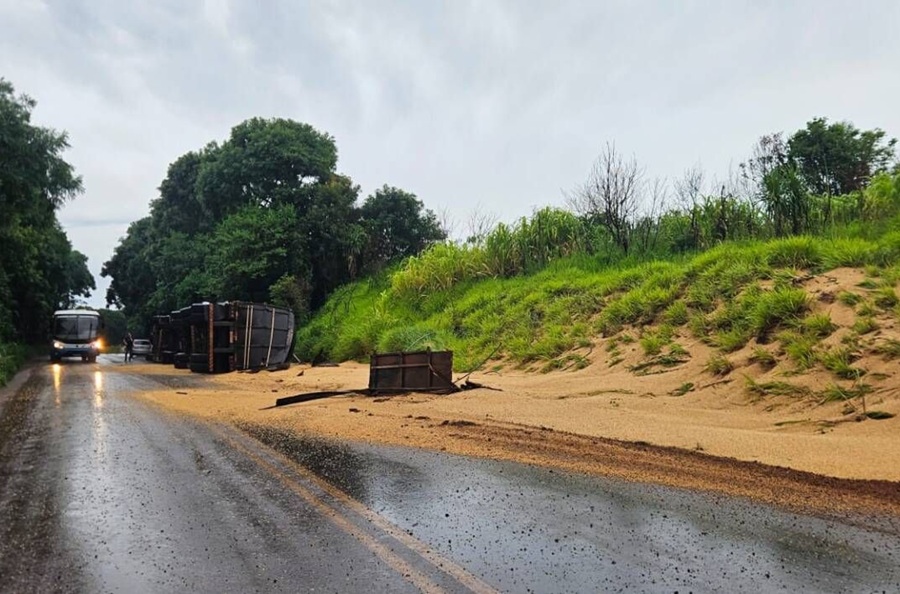 Com o tombamento, parte da carga ficou espalhada pelo acostamento e parcialmente sobre a pista, exigindo atenção redobrada dos motoristas que trafegam pelo trecho.