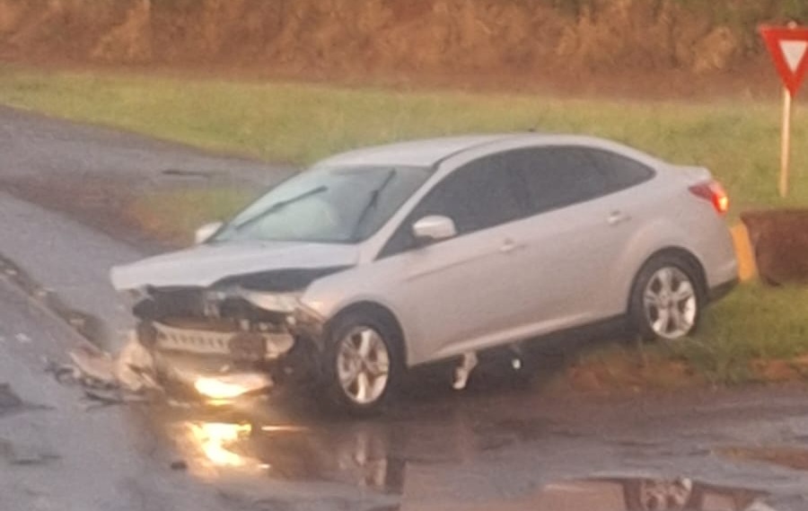Com isso, o Ford/Focus acabou colidindo contra o letreiro de concreto que indica a entrada da cidade de Campo Novo. O veículo teve grandes danos materiais, especialmente na parte frontal.