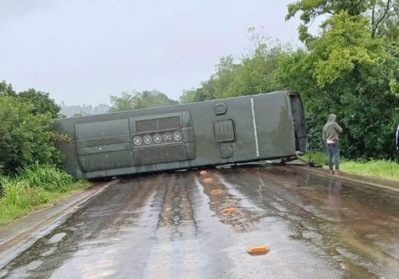 Um ônibus do Exército Brasileiro, que havia saído de Santa Rosa e seguia em direção a São Borja, tombou na manhã desta terça-feira na rodovia RS-168, nas proximidades do trevo de acesso a Roque Gonzales. O coletivo se deslocava para buscar a fanfarra do 2º Regimento de Cavalaria Mecanizado (2º RCMec), que seria transportada a Santiago para uma apresentação.