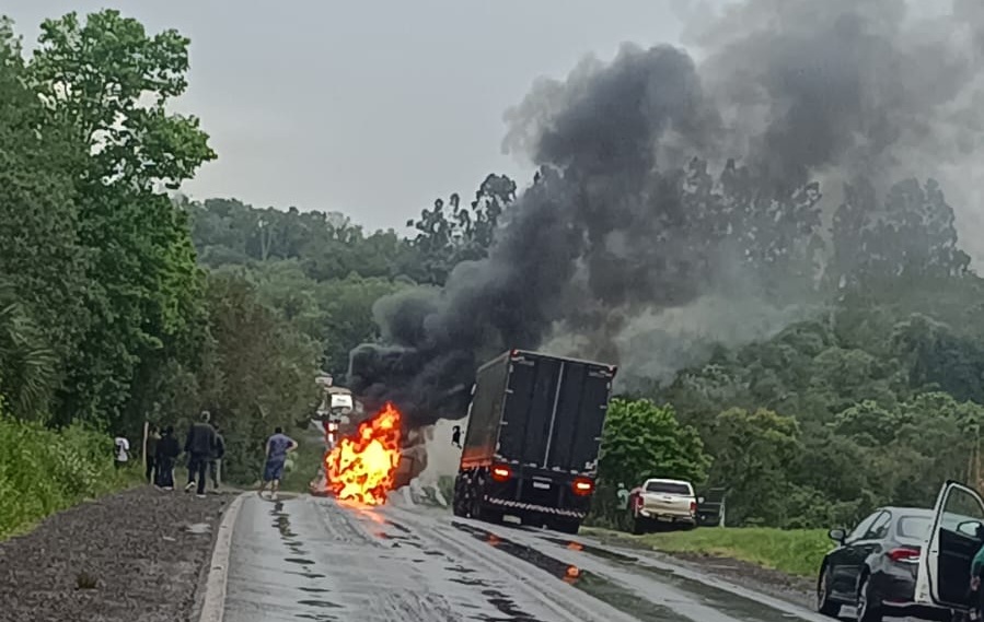 Equipes do Corpo de Bombeiros, da Polícia Rodoviária Federal e da perícia trabalham no local. O trânsito na rodovia está lento em função da ocorrência.